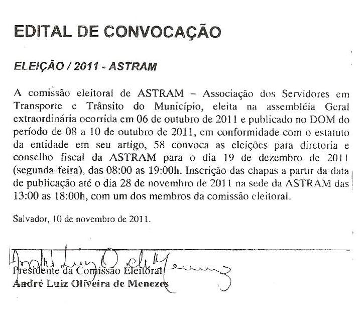 O prazo para inscrição das chapas é até o dia 28 de novembro de 2011 (próxima segunda-feira), na sede da ASTRAM das 13:00 as 18:00h,